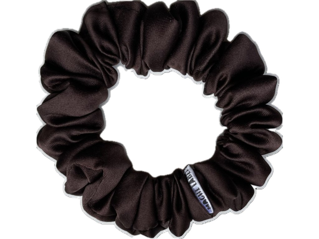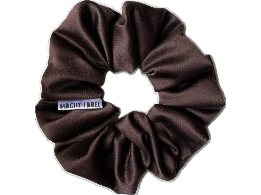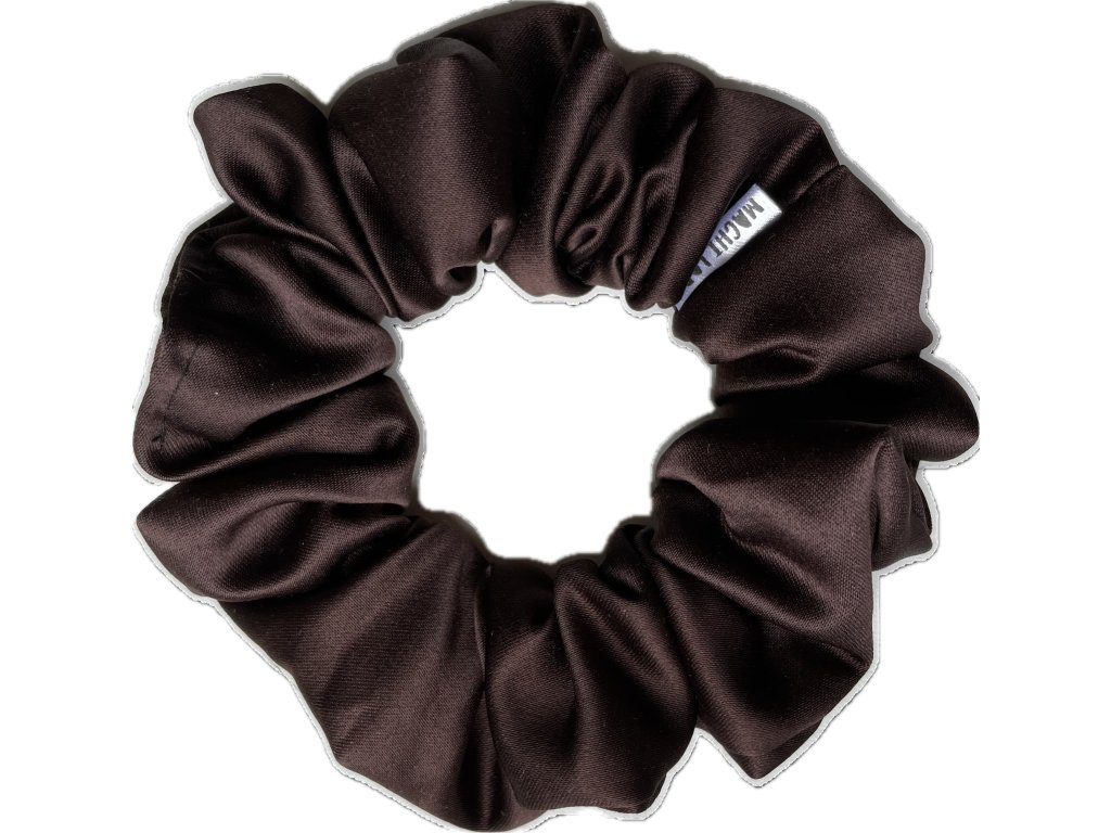 Saténová scrunchie gumička v barvětmavé čokolády. Látka, ze které je gumička ušitá je z pružného lesklého saténu s přídavkem elastanu.