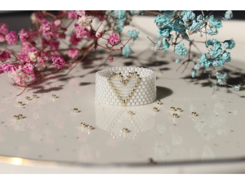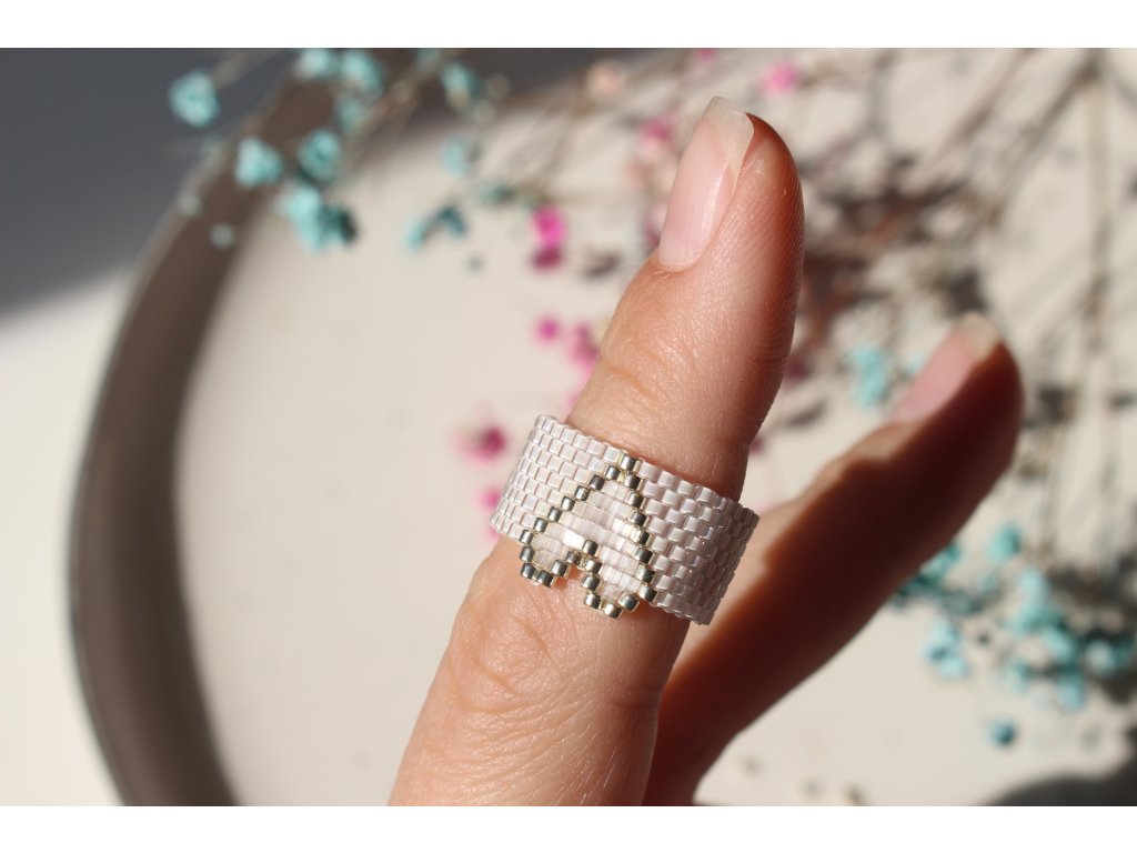Prsten Frozen Heart je symbolem klidu a čistoty. Ručně šitý z korálků Miyuki Delica v bílé a stříbrné kombinaci s motivem srdce.