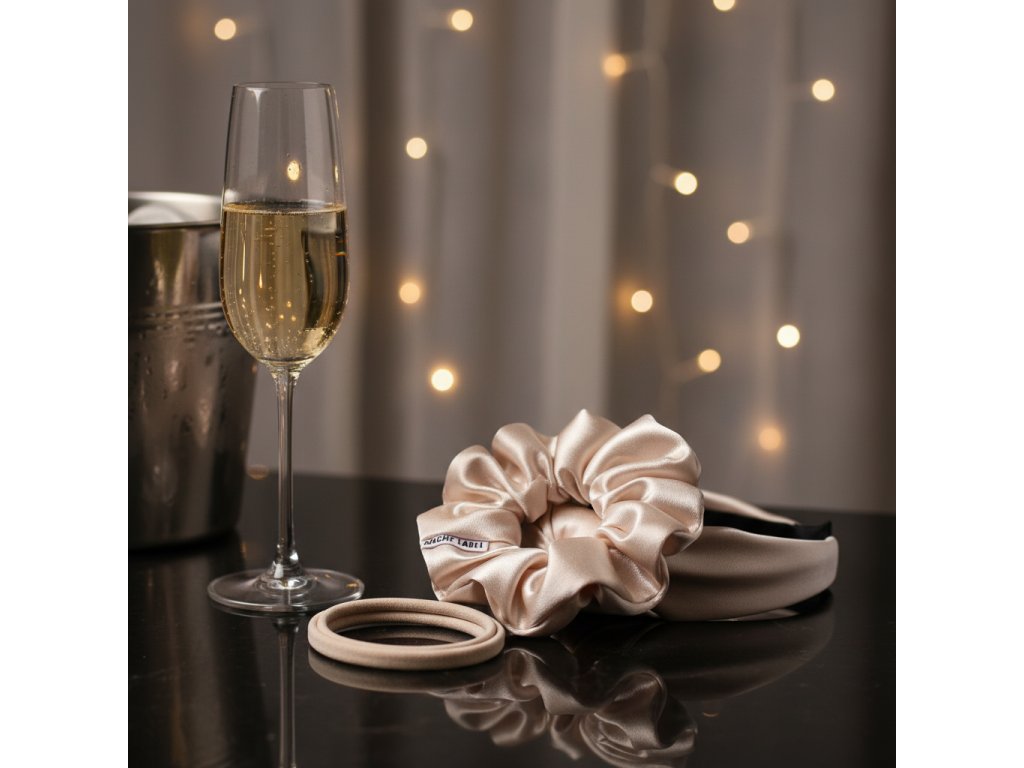Exkluzivní scrunchie gumička z limitované edice, ušitá z prémiového saténu v barvě šumivého vína, je dokonalým doplňkem pro každou příležitost. Tato luxusní gumička je navržena tak, aby poskytovala jemnost a šetrnost k vlasům, zatímco její elegantní barva přidává nádech sofistikovanosti.