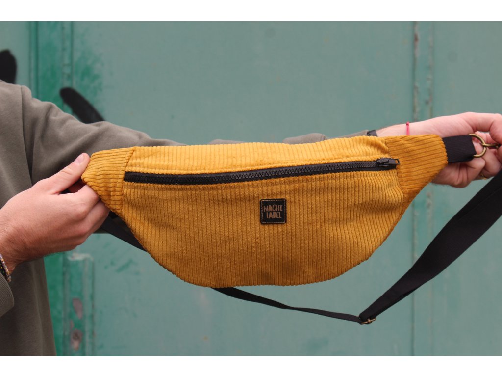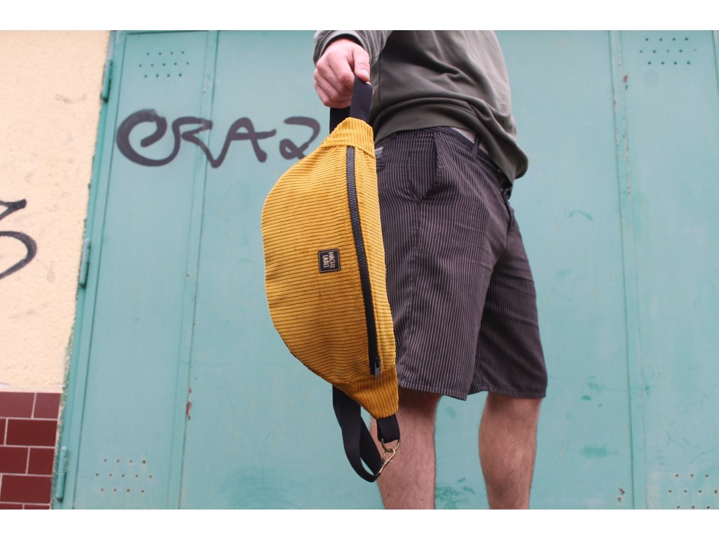 Prostorná ledvinka s kvalitním béžovým zipem, je ušitá z měkkého manšestru v hořcicové barvě. Má jednu kapsu a posunovací popruh.
