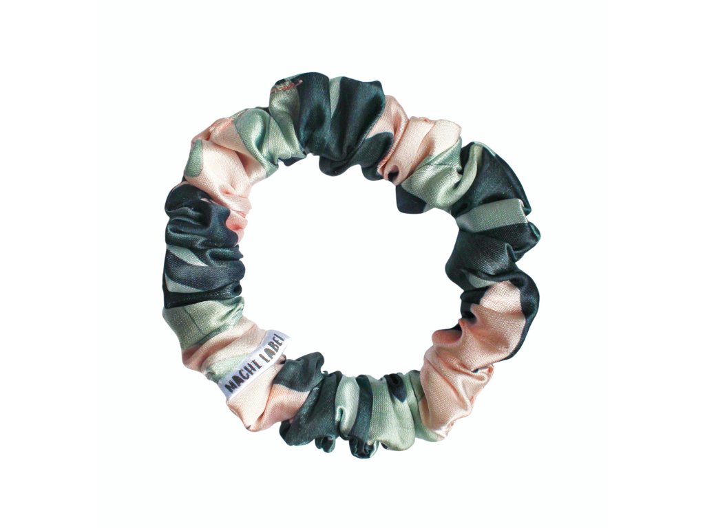 Nádherná saténová gumička do vlasů s nenápadným vzorem monstery na lososovém podkladu.