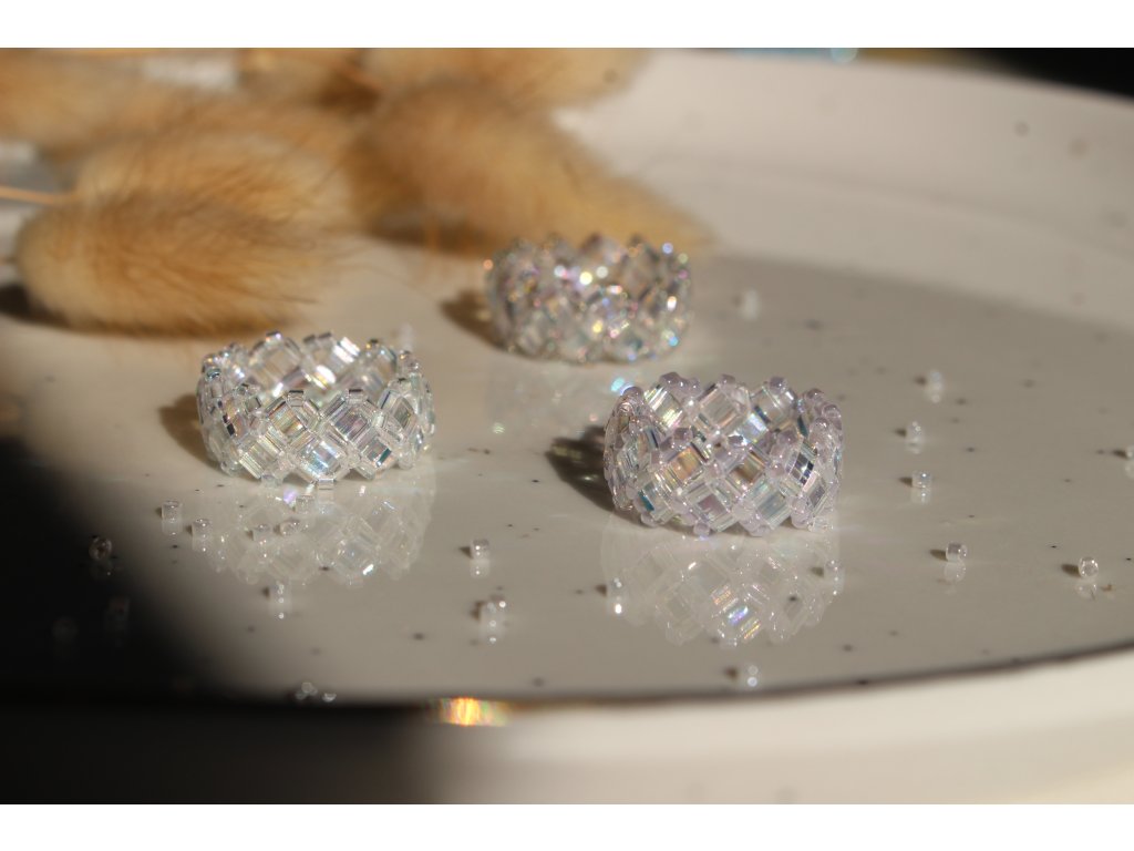 Miyuki Tila prsten Pearly Crystal je ručně šitý z prémiových japonských korálků Miyuki Tila a Delica. Díky preciznímu zpracování vzniká prstýnek s nádherným perleťovým odleskem, který působí elegantně a jemně zároveň.