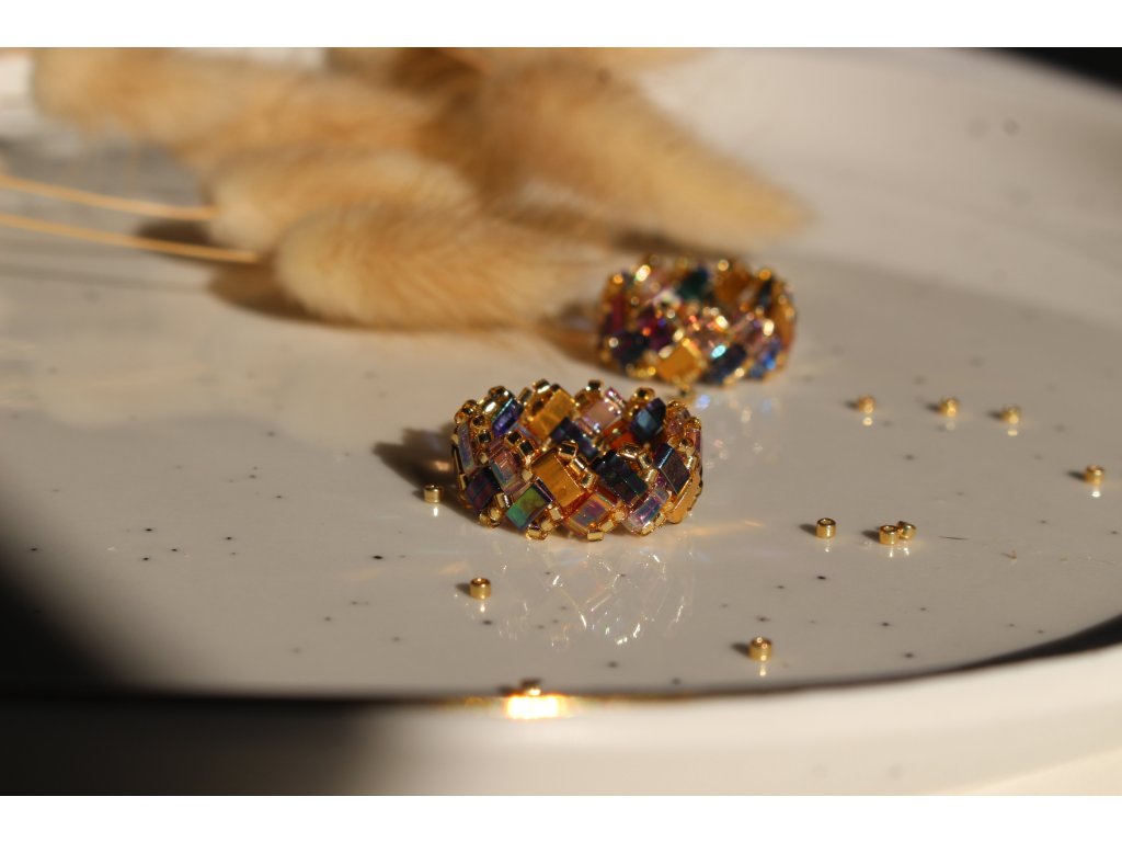 Prsten ROYAL je ručně ušitý z luxusních japonských korálků Miyuki delica a Miyuki Tila v autorském designu. Obsahje několik barev japonských korálků, včetně pozlacených.