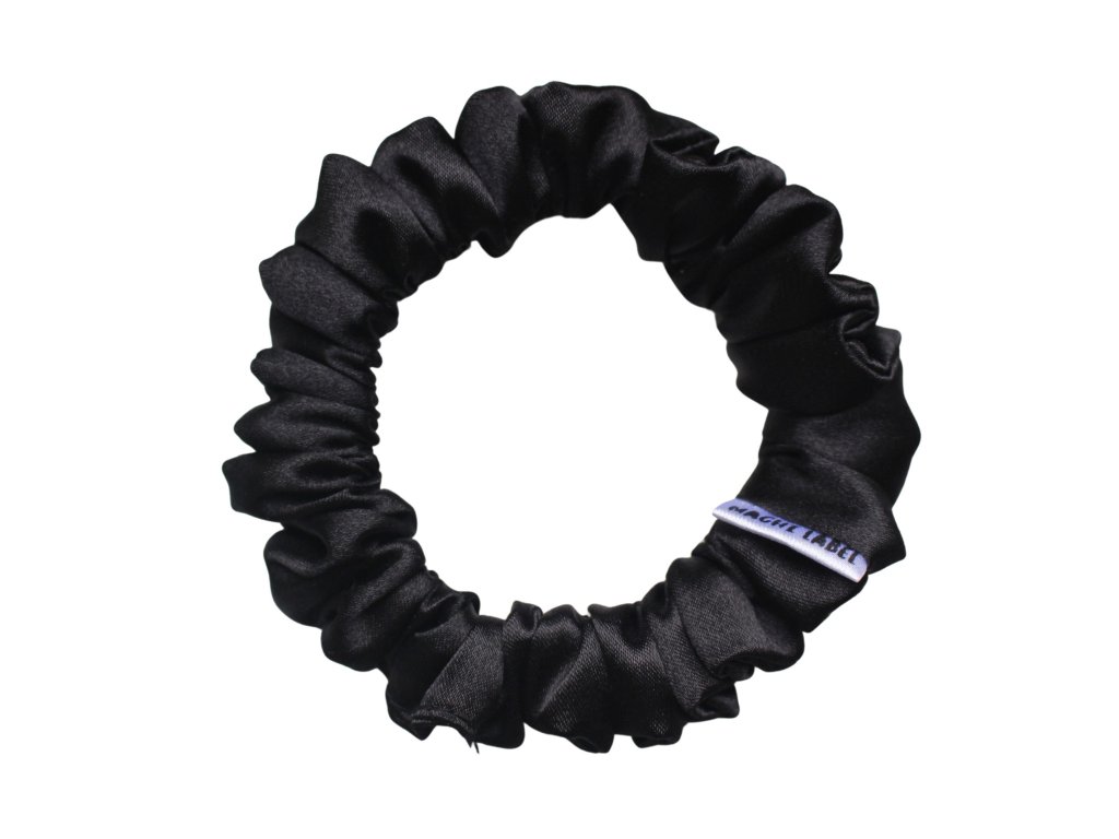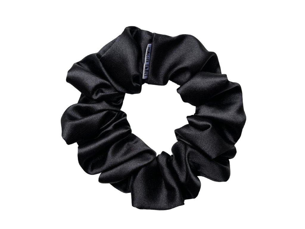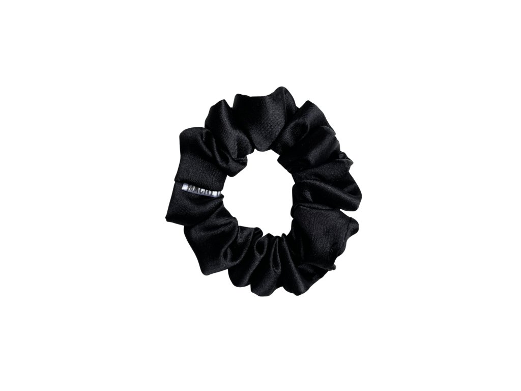 Saténová scrunchie gumička v černé barvě. Gumička je ušita ve třech velikostech z lesklého pružného saténu s přídavkem elastanu.