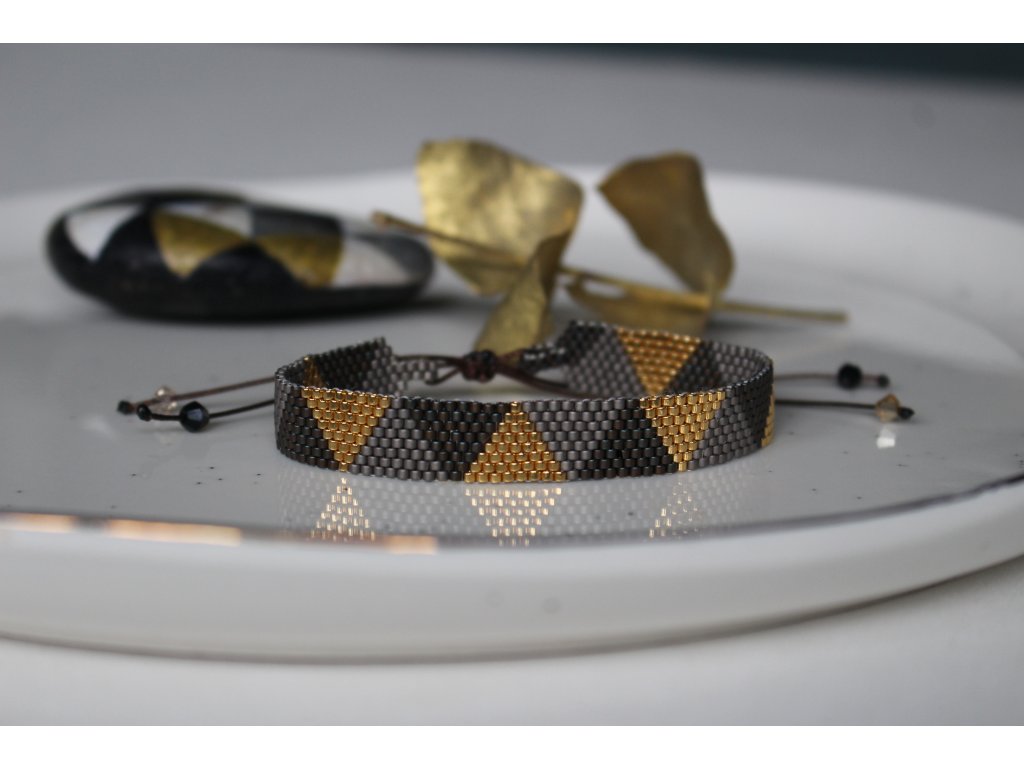 Náramek TRIANGLES PREMIUM je vytvořen prémiovými pozlacenými Miyuki korálky, pokovenými hnědými a stříbrnými korálky.